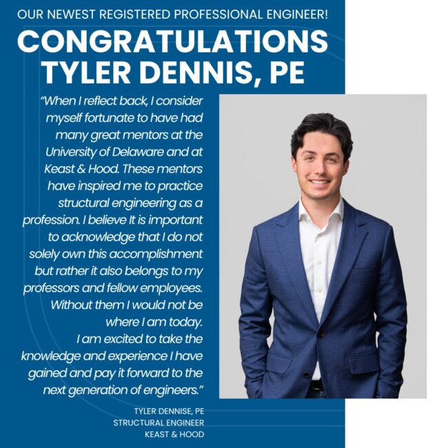 Tyler Dennis, PE is a Structural Engineer who has worked for Keast and Hood since April 2023. He has a Bachelor’s and a Master’s degree in Civil Engineering from the University of Delaware. His current projects include the renovation of the First Bank of the United States, Muhlenberg College Seegers Union Building Expansion, and Princeton University Prospect House renovations. Tyler is a member of the DVASE Young Members Group.