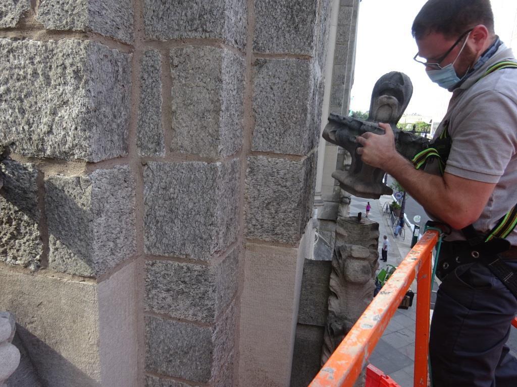 During construction, masonry elements were methodically documented, with each stone numbered, removed, cleaned, and reset to preserve the historic fabric. Severely deteriorated roof framing within the towers was replaced with galvanized steel members and a modern roofing system, improving long-term performance while respecting the building’s historic form. Select decorative limestone elements were refabricated where necessary, with existing stones strategically relocated to prominent elevations to maintain visual continuity. The façade was fully cleaned and repointed as part of the restoration effort.